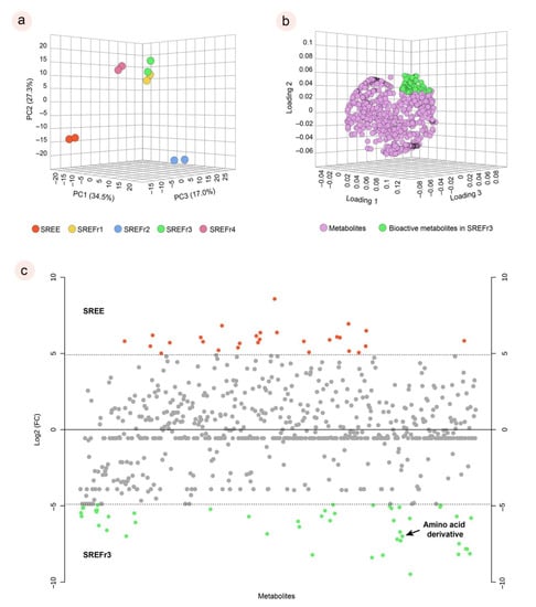 Principal component of analysis (PCA) for the extract and its fractions in duplicates (a); main bioactive metabolites for the SREFr3 highlighted in green (b); and fold change chart between SREE and SREFr3. Red points refer to metabolites in high relative concentration in SREE with at least a double change; Green points refer to metabolites in high relative concentration in SREFr3 with at least a double change; Grey points no significant fold changes were observed (c).