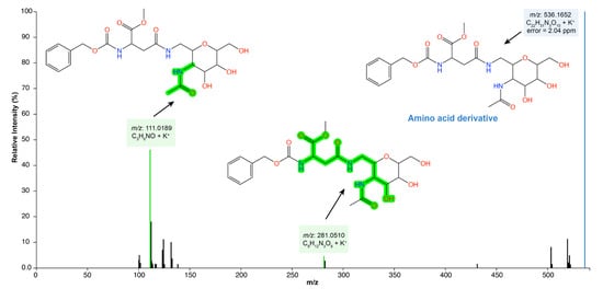 SREFr3 MS/MS spectrum highlighting annotated product ions of m/z 281 and m/z 111, which have amino acid derivatives from asparagine (green shadow).