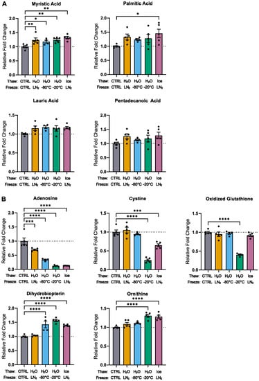 Bar graphs comparing the most changed metabolites across freeze and thaw conditions (10 cycles each) except for the control (CTRL) that was cycled 1 time. (A) Fatty acids increase in all freeze–thaw conditions compared to control. (B) Specific metabolites decrease or increase depending on freeze–thaw condition. Data are presented as the mean ± standard error. p-values were calculated by one-way ANOVA with the Holm–Sidak post hoc multiple comparison test compared to control; * p < 0.05, ** p < 0.01, *** p < 0.001, **** p < 0.0001. (n = 4–5 technical replicates).