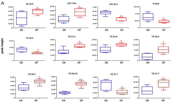 Normalized peak intensity of amniotic fluid lipids after CP treatment (n = 6). (A) Positive ion mode; (B) negative ion mode. n= 6. Each data point represents the mean ± S.E.M. * p < 0.05 and ** p < 0.01, versus CK.