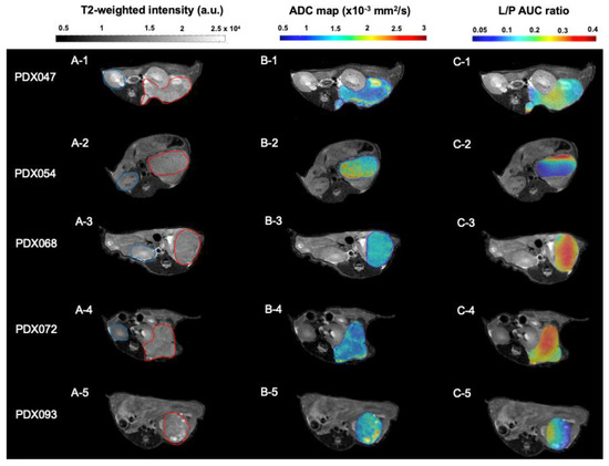 (A1–A5) Representative T2-weighted MR images of PDX implanted under the murine renal capsule. Blue and red lines were drawn along the borders of the contralateral kidney and tumor, respectively. Images show intra-tumoral heterogeneity in some PDX, especially hyperintense components. (B1–B5) Representative ADC maps overlaid on the T2-weighted images of PDX tumors. ADC images highlight differences in water diffusion among PDX with intra-tumoral heterogeneity in most tumors. (C1–C5) Representative L/P AUC ratio maps overlaid on the T2-weighted images of PDX tumors, reflecting intra-tumoral variation in glycolytic metabolism in all tumors. a.u.= arbitrary units; AUC = area under the curve.