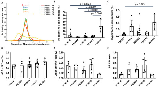 Data are expressed as mean ± SD. A one-way ANOVA was used to compare differences in T2-weighted intensity features, ADC values, L/P AUC ratio, and tumor growth rate among PDX tumors followed by a Tukey’s test for multiple comparisons. Differences between two generations of tumors of the same PDX, or PDX tumors and its corresponding XEN tumors, were assessed with an unpaired t-test. Differences were considered significant at a p-Value < 0.05. All statistical analyses were performed with GraphPad Prism 9 (GraphPad Software Inc., San Diego, CA, USA).