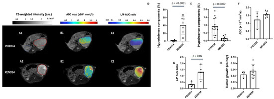 Comparison of features of PDX054 and XEN054. Panel on left: (A1,A2) Representative T2-weighted MR images of PDX and XEN implanted under the murine renal capsule. Red lines were drawn along the borders of the tumors. (B1,B2) Representative ADC maps overlaid on the T2-weighted images of PDX and XEN tumors. (C1,C2) Representative L/P AUC ratio maps overlaid on the T2-weighted images of PDX and XEN tumors. A.u.= arbitrary units; AUC = area under the curve. Bar graphs show: the % hyperintense (D) and % hypointense (E) components in all PDX and XEN tumors calculated from histograms of T2-weighted images; (F) ADC mean calculated for all PDX and XEN tumors; (G) the mean of the L/P AUC ratios for all PDX and XEN tumors; and (H) the tumor growth rate (cc/day). The significance of the one-way ANOVA with a Tukey’s multiple comparisons test is indicated above the plots. All p < 0.05 indicated statistical significance.
