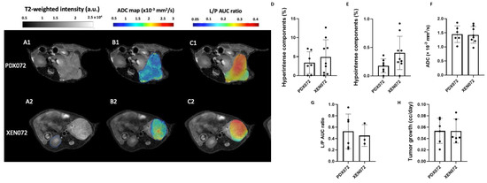 Figure 4A–C shows representative multiparametric MRI comparisons between PDX072 and XEN072. In contrast to the previously described PDX054/XEN054 models, PDX072 and XEN072 tumors exhibited similar T2-weighted intensities (Figure 4A), with less than 5% hyperintense regions (Figure 4D) and a negligible percentage of hypointense regions (less than 0.5%) (Figure 4E). Moreover, PDX072 and XEN072 tumors showed a similar mean ADC among the tumors (~1.4 × 10−3 mm2/s) (p = 0.87) (Figure 4F). There were also no significant differences in L/P AUC ratios (Figure 4G) or tumor growth rate (Figure 4H) between PDX072 and XEN072. In contrast to PDX/XEN054, passage of PDX072 cells through culture and back into mice did not appear to appreciably alter the phenotype of the resulting XEN tumors.