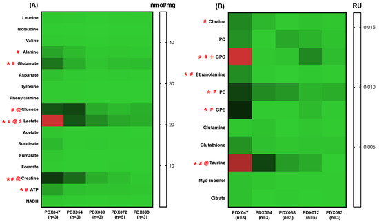 Heat maps showing (A) absolute concentrations (nmol/mg) and (B) concentrations relative to TSP (RU) of steady state metabolite levels among PDX. *: p < 0.05, PDX047 and PDX054, #: p < 0.05, PDX047 and other PDX except PDX054, @: p < 0.05, PDX054 and other PDX except PDX047, $: p < 0.05, between PDX068 and PDX072, and PDX068 and PDX093, +: p < 0.05, between PDX072 and PDX093.