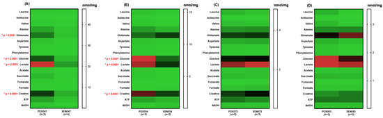 Heat maps showing absolute concentrations of steady state metabolites between PDX and their corresponding cell culture-derived XEN: (A) PDX/XEN047; (B) PDX/XEN054; (C) PDX/XEN072; (D) PDX/XEN093. * indicates statistical significance.
