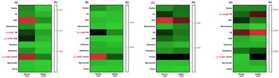 Heat maps of relative concentration (RU) to TSP of steady state metabolites between PDX and their corresponding cell culture-derived XEN: (A) PDX/XEN047; (B) PDX/XEN054; (C) PDX/XEN072; (D) PDX/XEN093. * indicates statistical significance.
