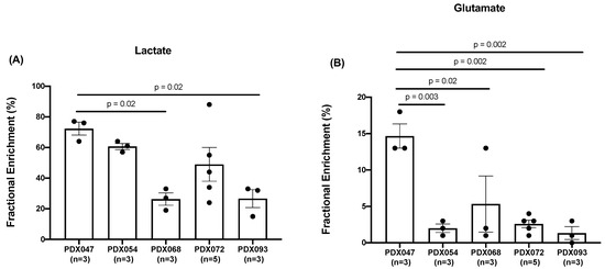 Comparison of fractional enrichment of (A) lactate and (B) glutamate among PDX.