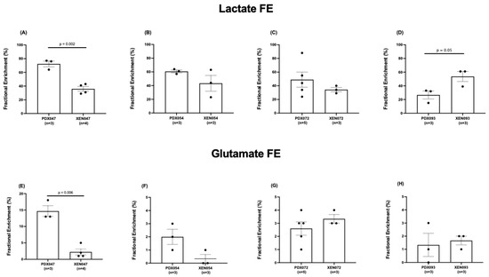 Comparison of fractional enrichment of (A–D) lactate and (E–H) glutamate between PDX and corresponding XEN. Statistical test used: unpaired t-test with Welch’s correction.
