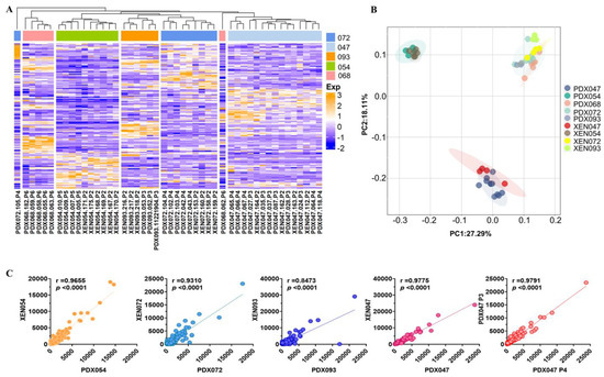 Total RNA was isolated from flash-frozen tissues using an AllPrep DNA/RNA mini kit (Qiagen, Hilden, Germany) and integrity was confirmed using an Agilent Bioanalyzer (Agilent Technologies, Santa Clara, CA, USA). RNA libraries were prepared using the PrepX mRNA library kit (Wafergen Bio-Systems, Fremont, CA, USA). RNA sequencing was carried out by Novogene Corporation Inc. (Sacramento, CA, USA) on the Illumina Hiseq system with paired-end reads up to 150 bp. Sequencing reads were aligned to the Gencode (GRCh38.p36) reference genome using STAR version 2.5.4b [20] (http://code.google.com/p/rna-star/, accessed on 20 March 2018) and gene counts produced with HTSeq [21]. Transcript counts were normalized to the total number of transcripts detected in each sample. The data were then filtered for genes with an average expression, taken across all samples, greater than one transcript per million. Gene expression data have been deposited in Gene Expression Omnibus (GEO Accession: GSE213857). The R packages ComplexHeatmap, Circlize, Vegan, ggplot2, and Corrplot were used for clustering analysis, principal component analysis and matrix correlation analysis with the PDX and XEN RNA-seq data (R software 4.2.1 https://www.r-project.org (accessed on 24 June 2022)). Pearson correlation analysis with the mean value of each PDX and XEN tumor was performed with Prism (version 9, GraphPad Software, SanDiego, CA, USA).