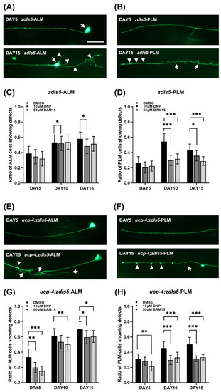 BAM15 attenuates neuronal defects in aged C. elegans. (A,B) Representative images of mechanosensory neurons in zdIs5 [Pmec-4::GFP] animals on Day 1 and Day 15; ALM and PLM, respectively. Arrows indicate soma and arrowheads indicate soma outgrowth and branching in ALM (A). Arrows indicate blebs and arrowheads indicate wavy processing in PLM (B). Scale bar = 50 µm. (C,D) ALM and PLM neuronal defects are presented as a ratio of the total ALM- and PLM-scored neurons in animals treated with 10 µM DNP and 50 µM BAM15 on Days 5, 10, and 15. (E,F) Representative images of mechanosensory neurons in ucp-4;zdIs5 animals on Days 1 and 15; ALM and PLM, respectively. Arrows indicate neuronal sprouting and arrowhead indicates a bleb in ALM (E). An arrow indicates branching and arrowheads indicate blebs (F). (G,H) ALM and PLM neuronal defects are presented as a ratio of the total ALM- and PLM-scored neurons in ucp-4;zdIs5 animals treated with 10 µM DNP and 50 µM BAM15 on Days 5, 10, and 15. ALM, anterior lateral microtubules; PLM, posterior later microtubules. Data are represented as means of three independent experiments. Error bars represent the SEM. n = 80~120 worms per treatment in each experiment. * p < 0.05, ** p < 0.01, *** p < 0.001. Unpaired Student’s t-tests were performed to compare the DMSO control and treatments.