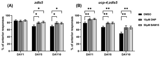 BAM15 retains touch responses in aged C. elegans. (A,B) Anterior touch responses are presented as a percentage of the total responses in zdIs5 and ucp-4;zdIs5 worms treated with 10 µM DNP and 50 µM BAM15 on Days 1, 5, and 10. Data are represented as means of three independent experiments. Error bars represent the SEM. n = 30 worms per treatment in each experiment. * p < 0.05, ** p < 0.01. Unpaired Student’s t-tests were performed to compare the DMSO control and treatments.