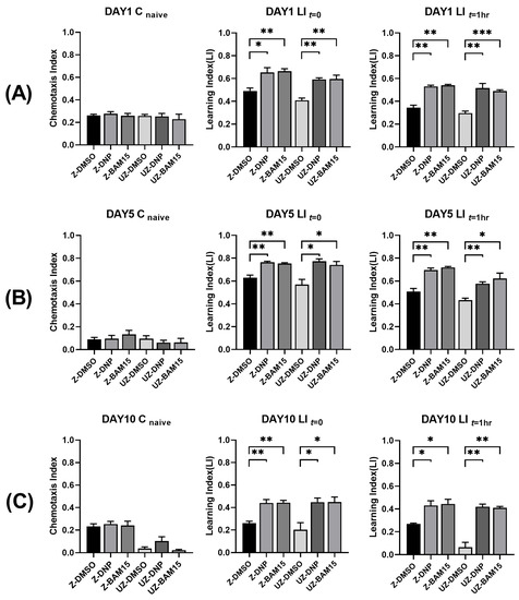 BAM15 retains learning ability and short-term memory in aged C. elegans. (A–C) Naive Chemotaxis Index (CI) and Learning Index (LI) in zdIs5 and ucp-4;zdIs5 treated with 10 µM DNP and 50 µM BAM15 on Day 1 (A), Day 5 (B), and Day 10 (C). t = 0, right after the training; t = 1 h, 1 h after the training. Z-DMSO—DMSO control in zdIs5; Z-DNP—10 µM DNP treatment in zdIs5; Z-BAM15—50 µM BAM15 treatment in zdIs5; UZ-DMSO—ucp-4;zdIs5 treated with DMSO; UZ-DNP—ucp-4;zdIs5 treated with 10 µM DNP; UZ-BAM15—ucp-4;zdIs5 treated with 50 µM BAM15. Data are represented as means of three independent experiments. Error bars represent the SEM. n = 150~300 worms per treatment in each experiment. * p < 0.05, ** p < 0.01, *** p < 0.001. Unpaired Student’s t-tests were performed to compare the DMSO control and treatments.
