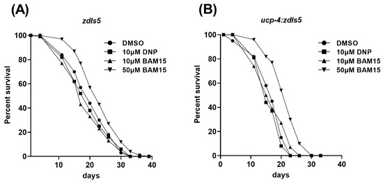 BAM15 extends the mean lifespan in C. elegans. (A,B) Kaplan–Meier survival curves of zdIs5 (A) and ucp-4;zdIs5 (B) treated with 10 µM DNP, 10 µM BAM15, and 50 µM BAM15. n = 248~309 per treatment in each genotype. Log-rank test, p < 0.001 between DMSO and 10 µM DNP, and DMSO and 50 µM BAM15 treatments. Data are presented as means of three independent experiments.