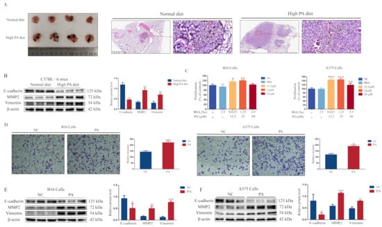 First, we investigated the cholesterol level in the serum of mice after a high-PA diet for two months. The high-PA diet group had higher cholesterol levels compared with the normal diet group (Supplementary Figure S1). The mice then received a tail-vein injection of melanoma cells (B16 cells), followed by a tumor growth period for 15 days. There were more metastases in the lungs of the mice in the high-PA diet group (Figure 1A). The epithelial–mesenchymal transition (EMT) plays an important role in tumor invasion and metastasis [18]. The EMT is characterized by changes in the morphology and molecular markers. Cells acquire the mesenchymal phenotype from a loss of epithelial-related markers and mesenchymal-related markers (including N-cadherin and Vimentin) and matrix metalloproteinases (MMPs) are upregulated [19]. Therefore, we detected E-cadherin, MMP2, and Vimentin expressions. The results showed a lower E-cadherin expression and higher MMP2 and Vimentin expressions in the tumors of the high-PA diet group (Figure 1B). These results indicated that PA promoted the lung metastasis of the melanomas. In addition, PA (25 μM) significantly promoted cell proliferation and invasion in B16 and A375 cells (Figure 1C,D), with a lower E-cadherin expression and higher MMP2 and Vimentin expressions compared with the control group (Figure 1E,F).