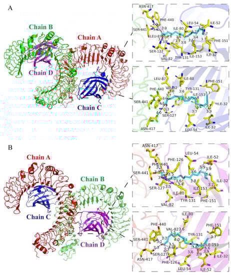 Molecular docking between PA and TLR4 Four chains of TLR4 are shown as multicolor bands. PA is shown as cyan sticks and TLR4 residues are marked with yellow sticks. (A) The image shows the docking pose, binding sites, and interactions between PA and the C-chain of TLR4. There were three hydrogen bonds between PA and the TLR4 protein residues, which were Ser-127 at 3.3 Å, Asn-417 at 3.6 Å, and Ser-441 at 3.6 Å. In addition, PA and TLR4 also formed 12 hydrophobic interactions in the C-chain, which were Ile-32 at 3.75 Å, Ile-52 at 3.93 Å, Leu-54 at 3.72 Å, Ile-80 at 3.60 Å, Val-82 at 3.73 Å, Leu-87 at 3.77 Å, Tyr-131 at 3.81 Å, Tyr-131 at 3.73 Å, Phe-151 at 3.66 Å, Ile-153 at 3.36 Å, Ile-153 at 3.54 Å, and Phe-440 at 3.88 Å. (B) Docking pose, binding sites, and interactions between PA and D-chain of TLR4. PA formed four hydrogen bonds with the TLR4 protein residues in the binding pocket of the D-chain, which were Ser-127 at 2.33 Å, Tyr-131 at 3.97 Å, Asn-417 at 3.00 Å, and Ser-441 at 2.25 Å. PA and the TLR4 protein residues formed 12 hydrophobic interactions in the binding pocket of the D-chain, which were Ile-32 at 3.57 Å, Ile-52 at 3.87 Å, Ile-52 at 3.94 Å, Ieu-54 at 3.57 Å, Ile-80 at 3.58 Å, Val-82 at 3.53 Å, Phe-126 at 3.5 Å, Tyr-131 at 3.4 Å, Tyr-131 at 3.95 Å, Phe-151 at 3.7 Å, Ile-153 at 3.8 Å, and Phe-440 at 3.73 Å.