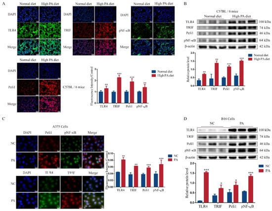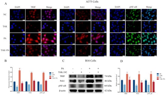 PA activated the TLR4/TRIF-Peli1-pNF-κB pathway in melanomas. (A) The fluorescence intensity and quantitative analysis of TLR4, TRIF, Peli1, and pNF-κB in mice lung tissues. (B) The blots of protein and quantitative analysis of mice lung tissues. (C) The fluorescence intensity and quantitative analysis of TLR4, TRIF, Peli1, and pNF-κB in A375 cells. (D) The blots of protein and quantitative analysis of B16 after PA treatment for 24 h. * p < 0.05, ** p < 0.01, or *** p < 0.001 compared with the control group.