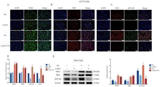 The fluorescence intensity and protein expression of TLR4/TRIF-Peli1-NF-κB pathway after si-Peli1. (A) The fluorescence intensity of TLR4 in A375 cells. (B) The fluorescence intensity of TRIF in A375 cells. (C) The fluorescence intensity of Peli1 and pNF-κB in A375 cells. (D) Quantitative analysis of fluorescence intensity. (E) The protein blots and quantitative analysis of TLR4, TRIF, and pNF-κB in B16 cells. In A375 and B16 cells, treatment with PA or si-Peli1 (+) and no treatment with PA or si-Peli1 (-). * p < 0.05, ** p < 0.01, or *** p < 0.001 compared with the control group. ## p < 0.01 or ### p < 0.001 compared with the PA group; the significance of the ANOVA.