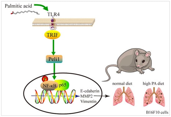 A high-fat diet plays an important role in aggravating cancers. Palmitic acid (PA) is one of the components of saturated fatty acids; it has been reported to promote tumor proliferation in melanomas, but the signal transduction pathway mediated by palmitic acid remains unclear. This study showed that palmitic acid can promote the lung metastasis of melanomas. Moreover, the interaction between palmitic acid and toll-like receptor 4 (TLR4) was predicted by molecular docking. The experimental results proved that palmitic acid could promote the TLR4 and Toll/IL-1 receptor domain-containing adaptor-inducing IFN-β (TRIF) expression. The expression of Pellino1 (Peli1) and the phosphorylation of NF-kappa B (pNF-κB) were downregulated after the suppression of TLR4 and the silencing of Peli1 also inhibited the phosphorylation of NF-κB. Therefore, we concluded that palmitic acid promoted the lung metastasis of melanomas through the TLR4/TRIF-Peli1-pNF-κB pathway.