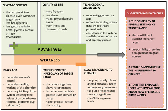 The results of the qualitative content analysis are presented in Figure 1. Three main categories were formed: (1) advantages of using the HCLs, (2) weaknesses of using the HCLs, and (3) suggested improvements. Overall, the women’s satisfaction with the HCLs was high. The main advantage of the HCLs identified was an easier achievement of the target glucose range. In addition, a lower number of hypoglycaemias, especially at night, contributed to an improved quality of life, with less stress and more freedom in everyday choices. Some participants emphasized fewer dietary restrictions when using the HCLs. In addition, engaging in physical activity was easier; however, reported physical activity intensity, frequency, and duration did not differ between both pregnancies (Supplementary Table S2). They recognized the advantage of modern technologies in easier glucose concentration monitoring via apps that also enable remote consultations with healthcare professionals. On the other hand, all of the participants pointed out that the main disadvantage of the HCLs was the feeling of not having full control over the pump and not always understanding its algorithm. They were also not satisfied with the slow response of the HCLs to increases in glucose concentration. Moreover, they could not choose a target glucose lower than 5.5 mmol/L, which many times caused them to fear that they would not be able to achieve good pregnancy outcomes, especially at the beginning of pregnancy. Regardless, all studied women would choose to use the HCLs again in their next pregnancy. At the same time, they suggested some improvements related to the pump settings (Figure 1).