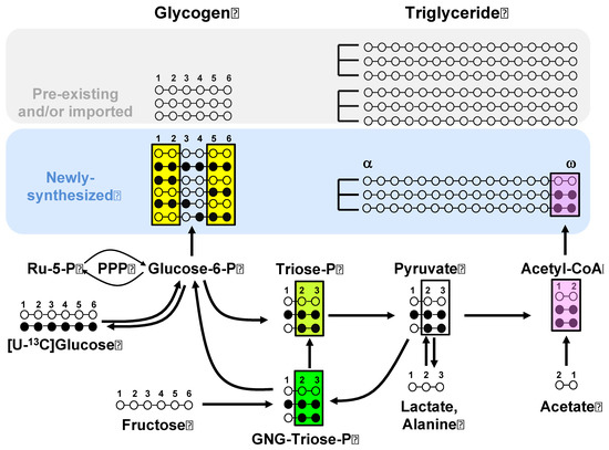 The following supporting information can be downloaded at: https://www.mdpi.com/article/10.3390/metabo12111142/s1, Figure S1: 13C-Isotopomers of selected metabolic intermediates generated from [U-13C]fructose metabolism into lipogenic and glycogenic pathways. These include hepatic glucose-6-P—inferred from the analysis of newly-synthesized glycogen; triose-P recruited for gluconeogenesis (GNG-triose-P)—inferred from the analysis of indirect pathway glycogen 13C-isotopomers; triose-P supplying glycerol-3-P for fatty acid esterification and acetyl-CoA units for de novo lipogenesis—inferred from the 13C-isotopomer analysis of newly-synthesized triglyceride glycerol, and the acetyl-CoA pool supplying lipogenesis—inferred from the 13C-isotopomer analysis of newly-synthesized fatty acids. For the metabolite carbon skeletons, the red filled and unfilled circles represent 13C and 12C, respectively. The shading highlights those isotopomers that form [U-13C]acetyl CoA and the colors indicate isotopic equivalence (same color) or non-equivalence (different colors). For simplicity, in depicting the fatty acid labeling, only the 13C-isotopomers of the last two fatty acid carbons (representing the first acetyl-CoA moiety to be incorporated into DNL) are shown.; Table S1: Liver glycogen 13C-isotopomer enrichments from mice provided with [U-13C]glucose (n = 4) and [U-13C]fructose (n = 5). The glycogen 13C-isotopomers shown in bold text are metabolized to [U-13C]acetyl-CoA. Table S2: Newly synthesized glycogen fraction (fglycogen) with direct and indirect pathway contributions to the newly synthesized glycogen (fdirect and findirect), and newly synthesized triglyceride glyceryl and fatty acid fractions (fglyceryl and ffatty acid) from 2H-enrichment data of liver glycogen and triglyceride, respectively.