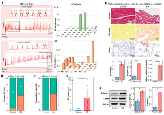 Moreover, Masson’s trichrome staining showed that atrial fibrosis was evidently increased in SD mice (p < 0.001), and the collagen content assessed by Sirius Red exhibited a similar tendency (p < 0.001), which was accompanied by the increased expression of collagen I and α-SMA (Figure 1F). Notably, Oil Red O staining of atrial sections demonstrated significant levels of lipid droplets in the SD vs. control mice (p < 0.001. Figure 1E). Taken together, these data suggested that SD increased susceptibility to AF and affected the atrial substrate.