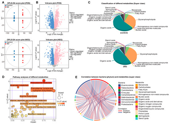 Changed metabolic patterns in plasma of SD mice. (A) Score scatter plots of orthogonal PLS-DA (OPLS-SA) comparing the plasma metabolic differences show the separation between control and SD in ES+ and ES−. ES+, positive ion mode; ES−, negative ion mode. (B) Volcano plots for the alterations of plasma metabolites between ES+ and ES− groups. Metabolite at p < 0.05 and variable importance (VIP) in the projection threshold of >1 was significantly different. Downregulation and upregulation were determined by fold-change. (C) Pie chart showing the proportion of metabolite annotated to the classification of superclass based on the metabolomics workbench. (D) Bubble analysis of metabolic KEGG pathways between control and SD group. (E) Circos plots showed Spearman’s correlation analysis (p < 0.05) between phyla and metabolites classified based on the superclass. Red indicates a positive correlation, and blue indicates a negative correlation. Each phylum and metabolic superclass were seen in a different color.