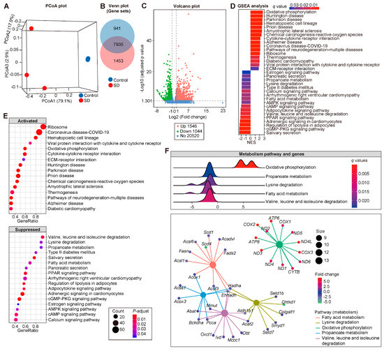 In parallel to metabolomic measurements, genome-wide analyses of changes in gene expression (RNA-sequencing) were performed. The atrium transcriptome of SD mice was different from the controls. A distinct separation was acquired from principal coordinate analysis (PCoA) (Figure 4A), which showed that SD remarkably impacts atrial transcriptomes. At the transcript level, 7935 mRNAs were detected in common between control and SD atrium (Figure 4B), among which 2590 mRNA were identified as the differential expressed genes (DEGs. Table S5), with 1546 upregulated and 1044 downregulated genes in SD compared with the control group (FDR < 0.05 and |log2FoldChange| > 1; Figure 4C).