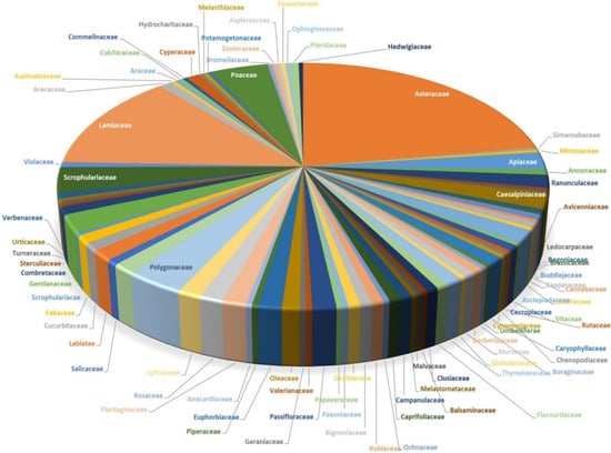 Luteolin’s therapeutic benefits have led the scientific community to explore its potential more. The search in the NCBI PubMed database retrieved more than five thousand articles showing its potential nature. The plant kingdom is the major source of this compound, and it is present as LUT or as luteolin glycosides. Its wide distribution among plants is well documented, as more than 300 plant species were reported to possess LUT or its derivates [9]. Its presence is even documented in the 36- and 25-million-year-old fossils of Celtis and Ulmus species, respectively [10]. The presence of LUT was identified among monocotyledons and dicotyledons. Among the plant kingdom, in the families of Asteraceae, Lamiaceae, Poaceae, Leguminosae, and Scrophulariaceae species, the LUT and its glycosides were identified in 66, 38, 13, 10, and 10 species, respectively (Figure 2).