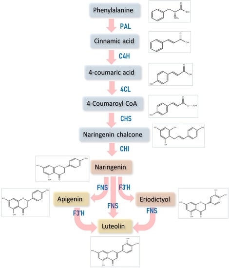Diagrammatic representation of the biosynthesis of luteolin. PAL—phenylalanine ammonia lyase; C4H—cinnamate 4-hydroxylase; 4-CL—coumarate 4-ligase; CHS—chalcone synthase; F3′H—flavonoid 3′-hydroxylase; CHI—chalcone isomerase; FNS—flavone synthase.