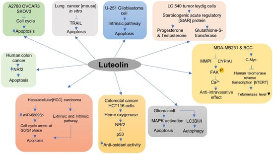 The mechanistic action of luteolin and its types against various types of cancer cells.