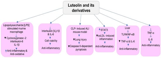 Inflammation is a response to stimuli induced by immune cells and non-immune cells in our body by involving various biochemical pathways and different molecules. It is a natural process of how the body responds to a stimulus with the help of immune cells such as natural killer cells, macrophages, and their molecular pathways. However, the inflammation response is needed to reduce the impact of the stimuli, further affecting the normal cells, but prolonged inflammation affects normal functioning as it leads to chronic conditions, so it needs to be prevented. For managing it, anti-inflammatory molecules are administered to protect cells from adverse effects [77]. Luteolin has anti-inflammatory properties, which are shown in Figure 5. Luteolin decreases the oxLDL-activated inflammation by inhibiting a signal transducer and activator of transcription 3 (STAT3) in vitro. One study showed its interaction with STAT3 primarily through hydrogen bonds [78]. Luteolin administration alleviates lung injury by attenuating caspase-2-based pyroptosis in the lung tissue of cecal ligation and puncture (CLP). Also in the induced ALI mouse model, it regulates the mechanism related to the frequency of regulated T cells (Treg) and the Treg-derived IL-10 [79].