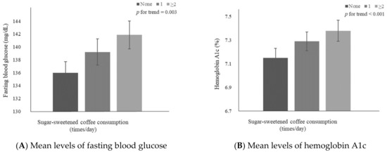 Mean levels of (A) fasting blood glucose and (B) hemoglobin A1c according to the frequency of sugar-sweetened coffee consumption. Values were adjusted for age (continuous), sex, education level (middle school graduation or lower and high school graduation or higher), household income (low, mid-low, mid-high, and high), smoking status (non-smokers and smokers), alcohol consumption (non-drinkers and drinkers), physical activity (continuous), DM medical treatment status (oral hypoglycemic agents or insulin treatments and no treatment), body mass index (continuous), DM duration (continuous), and total energy intake (continuous).