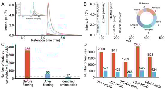 Feature filtering results of model systems. (A) Extracted ion chromatograms of lysine and its co-eluted MS features grouped by CAMERA in a glucose and lysine model system analyzed by iHILIC-Fusion. (B) Interpretation of the MS features grouped with lysine. Top right: Pie chart of the proportions of peaks categorized by the annotations. (C) The number of features co-eluted and grouped with amino acids in the model systems mixture of twenty-one amino acids (MSM1) before and after filtering analyzed by iHILIC-Fusion. (D) The total feature number detected in MSM1 before (red) and after filtering (blue) analyzed by different HILIC columns.