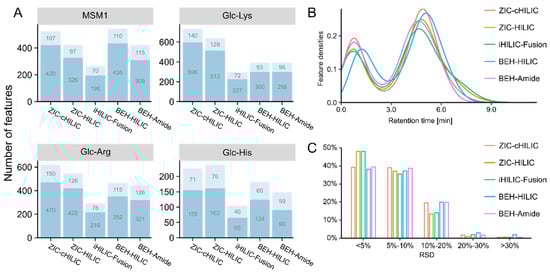 Results of column selection. (A) Bar plots representing the number of features detected by different columns in each model system. Features were categorized into two types: features with MS2 (light blue) and features without MS2 but recognizable extracted ion chromatograms (dark blue). MSM1: the model systems mixture of twenty-one amino acids. (B) Retention time distribution of all detected features in model systems. (C) Relative standard derivation (RSD) distribution of all feature intensities.