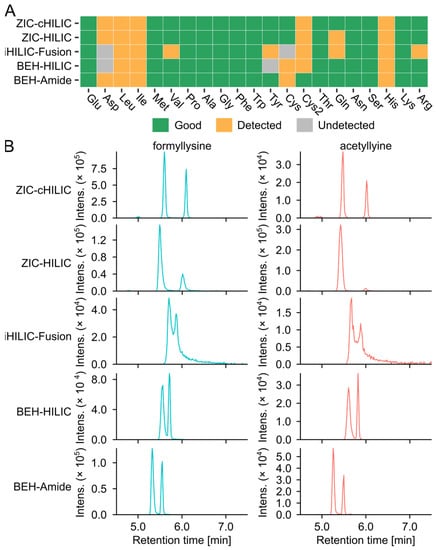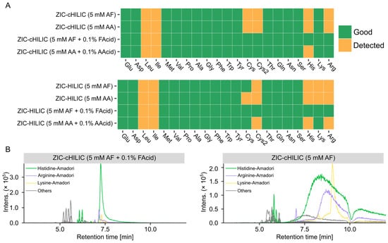 The performance of all tested chromatographic conditions for analyzing amino acids is summarized in Figure 5A and Table S8. ZIC-cHILIC and ZIC-HILIC operated with mobile phase containing 5 mM AF and 0.1% FAcid can detect the highest number of amino acids with good peak shape. Mobile-phase pH has a higher impact on the peak shape of amino acids compared to column chemistry. Basic amino acids, including Lys, Arg, and His, have broad peaks under neutral conditions. One reason is the electrostatic attraction between the positively charged side chain of basic amino acid and the negatively charged silica under the neutral condition [31]. For His, the pKa of its side-chain group is 5.97. Under the neutral condition, the side chain of His is half deprotonated causing the broad peak shape. Cys and Cys2 were detected with good peak shape only under acidic conditions as well. The baseline separation of Ile and Leu was not achieved for all tested methods; however, a better separation was obtained by ZIC-cHILIC compared with ZIC-HILIC, which merged into one peak analyzed by ZIC-HILIC under most tested mobile phases.