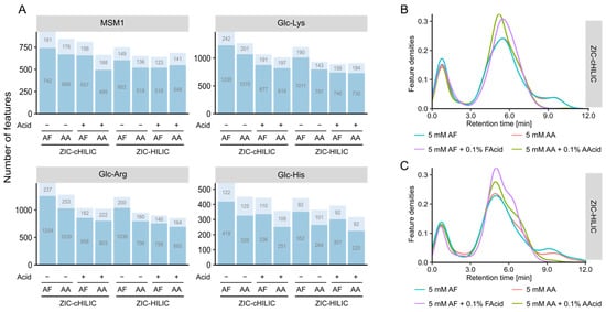 Effects of mobile phase composition on feature coverage and distribution. (A) Bar plots representing the number of detected features analyzed by mobile phases consisted of 5 mM ammonium formate (AF) or 5 mM ammonium acetate (AA) with and without its corresponding acid (0.1%, v/v). (B) Density distribution of retention times across the chromatographic run for ZIC-cHILIC column and (C) ZIC-HILIC column.