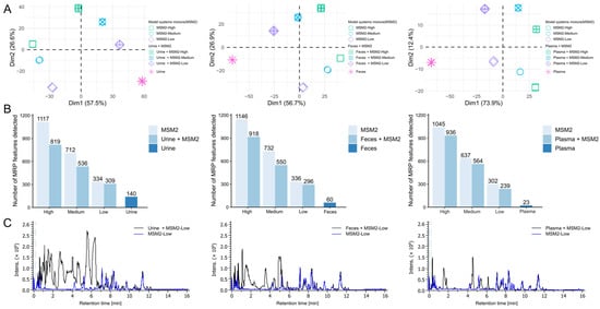 Detectability of glycation products in the biological matrices. (A) Principal component analysis (PCA) score plots of biological samples, a model system mixture (lysine and arginine; MSM2), and model system-spiked biological samples, in an order of urine, feces, and plasma. Prior to spiking, the model system mixture was either not diluted (high) or diluted 1:5 (medium) or 1:25 (low). Measurement was performed using the optimized HILIC method described in Section 2. (B) Bar plots representing the number of detected MRP features depending on the dilution level and biological extracts. (C) Representative base peak chromatograms of MSM2-Low and MSM2-spiked biological samples.