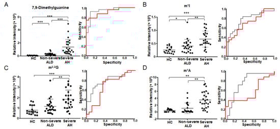 Modified nucleosides/bases with significant abundance change in urine detected by untargeted metabolomics using 2DLC-MS. The scatter plot on the left shows the abundance of 7,9-dimethylguanine (A), m1I (B), m2,2G (C) and m1A (D) in urine. The plot on the right shows the ROC analysis results. The red curve shows the ROC analysis results of HC vs. non-severe ALD. The AUC of 7,9-dimethylguanine (A) is 0.911, p < 0.001 and 95% CI = 0.824–0.998. The AUC of m1I (B) is 0.710, p = 0.022 and 95% CI = 0.553–0.867. AUC of m2,2G (C) is 0.677, p = 0.057 and 95% CI = 0.502–0.852. AUC of m1A (D) is 0.563, p = 0.495 and 95% CI = 0.382–0.744. The black curve shows the ROC analysis result of non-severe ALD vs. severe AH. The AUC of 7,9-dimethylguanine (A) is 0.934, p < 0.001 and 95% CI = 0.863–1.000. The AUC of m1I (B) is 0.763, p = 0.002 and 95% CI = 0.624–0.903. AUC of m2,2G (C) is 0.791, p = 0.001 and 95% CI = 0.662–0.920. AUC of m1A (D) is 0.757, p = 0.002 and 95% CI = 0.610–0.903. One-way ANOVA was used for the statistical significance test with the Tukey method for post-hoc analysis and the Benjamini and Hochberg method for multiple test correction, * q < 0.05; ** q < 0.01; *** q < 0.001. m2,2G, N2, N2-dimethylguanosine; m1A, 1-methyladenosine; m1I, N1-methylinosine.