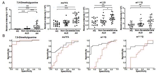 Modified nucleosides/bases with significant abundance change in urine detected by targeted metabolomics using SPE RPC-MS. (A) is the abundance changes of modified nucleosides/bases in the urine of patients. (B) shows ROC analysis results. The red curve shows the ROC analysis results of HC vs. non-severe ALD. The AUC of 7,9-dimethylguanine is 0.968, p < 0.001 and 95% CI = 0.921–1.000. The AUC of ms2t6A is 0.658, p = 0.092 and 95% CI = 0.483–0.833. AUC of m2,2G is 0.526, p = 0.784 and 95% CI = 0.332–0.721. AUC of m2,2,7G is 0.585, p = 0.378 and 95% CI = 0.397–0.772. The black curve shows the ROC analysis result of non-severe ALD vs. severe AH. The AUC of 7,9-dimethylguanine is 0.969, p < 0.001 and 95% CI = 0.909–1.000. The AUC of ms2t6A is 0.796, p = 0.001 and 95% CI = 0.665–0.927. AUC of m2,2G is 0.856, p < 0.001 and 95% CI = 0.740–0.971. AUC of m2,2,7G is 0.791, p = 0.001 and 95% CI = 0.645–0.937. One-way ANOVA was used for the statistical significance test with the Tukey method for post-hoc analysis and the Benjamini and Hochberg method for multiple test correction, * q < 0.05; *** q < 0.001. The p-value scale of the linear-by-linear association test is ### p < 0.001. ms2t6A, 2-methylthio-N6-threonylcarbamoyladenosine; m2,2G, N2, N2-dimethylguanosine; m2,2,7G, N2,N2,7-trimethylguanosine.