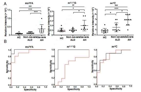 Modified ribonucleoside changes in the serum of the patients with ALD detected by targeted metabolomics using SPE RPC-MS. Nucleosides were extracted from the serum of healthy volunteers (n = 11) and patients (n = 23) and detected by SPE LC-MS under positive mode. (A) is the abundance changes of modified ribonucleosides in the serum of patients. (B) shows ROC analysis results. The red curve shows the ROC analysis results of HC vs. non-severe ALD. The AUC of ms2t6A is 0.918, p = 0.001 and 95% CI = 0.801–1.000. AUC of m2,2,7G is 0.550, p = 0.705 and 95% CI = 0.280–0.820. AUC of ac4C is 0.843 p = 0.006 and 95% CI = 0.680–1.000. The black curve shows the ROC analysis result of non-severe ALD vs. severe AH. The AUC of ms2t6A is 0.989, p < 0.001 and 95% CI = 0.953–1.000. AUC of m2,2,7G is 0.944, p = 0.001 and 95% CI = 0.932–1.000. AUC of ac4C is 0.845 p = 0.007 and 95% CI = 0.672–1.000. One-way ANOVA was used for the statistical significance test with the Tukey method for post-hoc analysis and the Benjamini and Hochberg method for multiple test correction, * q < 0.05; *** q < 0.001. The p-value scale of the linear-by-linear association test is ## p < 0.01; ### p < 0.001. ms2t6A, 2-methylthio-N6-threonylcarbamoyladenosine; ac4C, N4-acetylcytidine; m2,2,7G, N2,N2,7-trimethylguanosine.