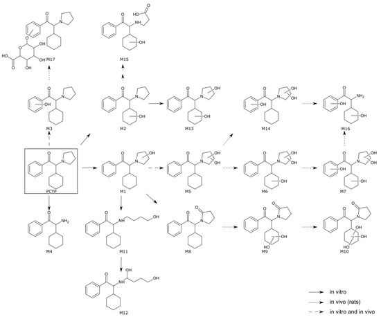 In vitro and in vivo metabolic pathways of PCYP. The parent compound is indicated by a black square, undefined hydroxylation positions are indicated by unspecific bonds. Metabolite identification numbers (M) match with the metabolites listed in Table S5.