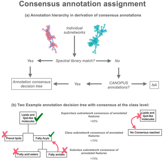 ConCISE consensus annotation pipeline. (a) Assignment hierarchy; identification of annotation sources within each molecular subnetwork. Spectral library matches are utilized prior to annotations from in silico annotation tools. (b) Consensus derivation decision tree used for either library spectral matches or in silico matches. Nodes with annotations must have consensus (>50%, >70%, >70%) at each classification level, respectively, (superclass, class and subclass) to receive the higher classification. If the nodes within the subnetworks cannot find a consensus above 50% at the superclass level, then ConCISE returns “No Consensus Reached” for that subnetwork.
