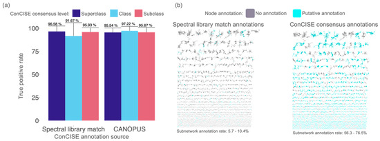 Manually verified true positive rate of ConCISE consensus annotations and increase in annotation rate. (a) True positive rate of each classification level in all three validation datasets. (b) Example network (MassIVE ID: MSV000082083) illustrating annotation rates from spectral library matches (left) and ConCISE (right) with putative annotations colored in light blue. Ranges in annotation rate were given for the three datasets used to verify ConCISE. Network annotation rates calculated without single-loop nodes.