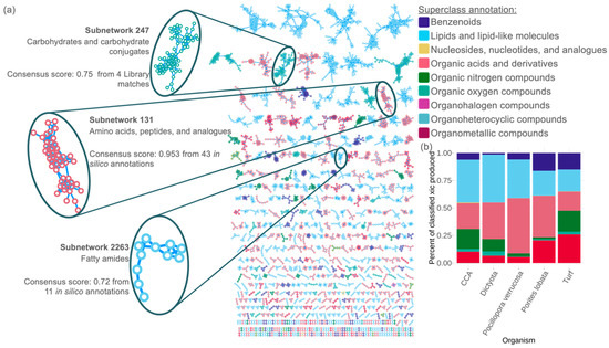 Putative identification of exometabolites released by coral reef primary producers. Dissolved organic matter chemo-diversity from flow-through organism incubations in Mo’orea, French Polynesia of crustose coralline algae (CCA), Dictyota ceylanica, turf algae, Pocillopora verrucosa, and Porites lobata. (a) The molecular network of ConCISE classified subnetworks from the incubations with nodes colored by superclass annotation. Three representative subnetworks have been highlighted to illustrate the narrower chemical classification which can be derived from ConCISE annotations along with the consensus score for the annotation within the molecular network. (b) Stacked bar chart illustrating the percent of classified extracted ion chromatogram (xic) which falls into each superclassification from each organismal incubation.