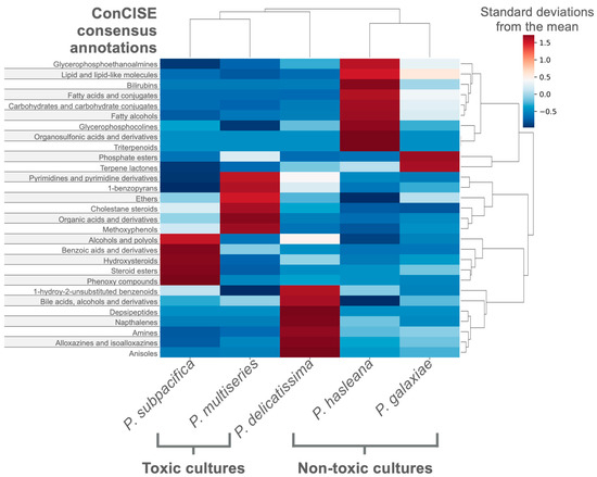 Pseudo-nitzschia is a genus of marine diatoms, which can form harmful algal blooms through the production of domoic acid, a neurotoxin that bioaccumulates in aquatic food webs endangering wildlife and human health. Though present worldwide, the specific conditions which promote Pseudo-nitzschia blooms and domoic acid production are poorly understood. Previous studies have shown that microbiomes of different Pseudo-nitzschia are species-specific [35,36] and microbial interactions mediated by metabolites can promote Pseudo-nitzschia growth [37]. A study by Koester et al. (2022) revealed that metabolomes are also species-specific and that nitrogen-containing compounds differentiated the Pseudo-nitzschia-microbiome cultures [38]. The prior study used both spectral matches and CANOPUS probabilities to illuminate the metabolomes of Pseudo-nitzschia cultures, however, propagation was limited to manual inspection. Using the ConCISE framework, we were able to demonstrate which compound classes are most specific to each of the five Pseudo-nitzschia cultures (Figure 4). The two toxic species of Pseudo-nitzschia clustered together when incorporating the relative production of each ConCISE classification, which agrees with the findings on feature level [38]. Within this case study, 56.3% of ion features received a putative consensus annotation with a mean consensus of 87.8%.