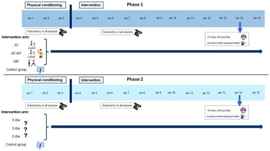 The intervention will be designed and implemented by a sports science professional. All groups in both phases will perform a minimum of 150 min of moderate physical exercise per week or a minimum of 75 min of vigorous exercise per week, always performed under the supervision of a sports science professional. During the intervention participants will progress to 300 min of moderate PA or 150 min of vigorous PA. Prior to the start of the full intervention, participants will undergo a 3-week pre-intervention physical conditioning. Each intervention will last 12 weeks (see Figure 1). Before starting the intervention program, participants will be referred to a physician for medical testing and clearance. During all physical exercise sessions, participants will wear a heart rate (HR) device that will relay their HR to a laptop, from which the sports scientist will be able to control the intensity of the session. The heart rate monitor model to be used is the Polar OH1, which has been validated in previous studies [47]. Polar HR monitors have demonstrated a high level of agreement with the electrocardiogram and can therefore be used as a valid measure of HR in both laboratory and field studies to measure HR during moderate-to-vigorous physical activity (MVPA) [47]. Heart rate will only be measured during the training sessions, with the aim to ensure that the intensity at which the participant performs the exercises is appropriate according to the protocol (it will vary for each intervention arm). Adherence to the intervention will be measured by attendance at the training sessions that make up the intervention.