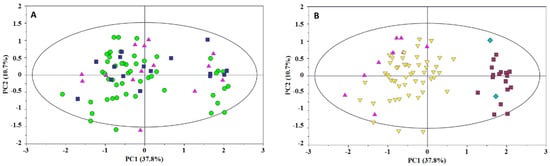 PC1 vs. PC2 scores plot of milk samples. Scores are colored according to: (A) the infant centile classification (AGA—green circle; LGA—blue square; SGA—pink triangle); (B) the milk phenotype (Se+/Le+—yellow inverted triangle; Se+/Le−—pink triangle; Se−/Le+—dark red box; Se−/Le−—blue diamond).
