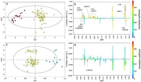 OPLS-DA scores (left) and correlation coefficient S-line (right) plots for the pairwise comparison of milk samples according to mother phenotypes: (A,B) Se+ (yellow triangle) vs. Se− (red box). R2Y = 0.894, Q2 = 0.850, p < 0.0001; (C,D) Le+ (yellow triangle) vs. Le− (blue diamond). R2Y = 0.843; Q2 = 0.411; p < 0.001).