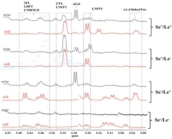 HMO NMR spectral regions between 5.0 and 5.5 ppm of four infant urine samples (black) and milk (red) samples associated to the Se+/Le+, Se+/Le−, Se−/Le+, and Se−/Le−mother’s phenotype. Abbreviations: 2′FL—2′fucosyllactose; 3FL—3fucosyllactose; LDFT—lactodifucotetraose; LNFP I—lacto-N-fucopentaose I; LNDFH II—lacto-N-difucohesaose II.